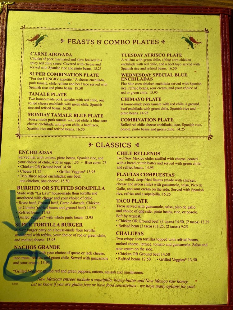 Served flat with cheese, onions, pinto beans, rice, garnish, and your choice of red or green chile. Comes with one sopaipilla